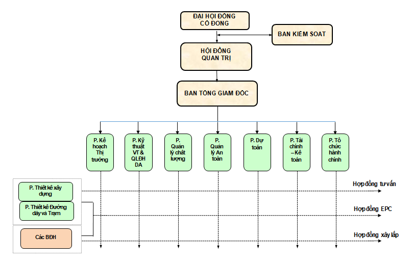 Hội đồng Quản trị (HĐQT): Hội đồng Quản trị đương nhiệm của Vinaincon E&C gồm Chủ tịch Hội đồng Quản trị và 04 thành viên. Trong đó, 01 thành viên tham gia điều hành và 04 thành viên không tham gia điều hành. Ban Kiểm soát (BKS): Ban Kiểm soát gồm Trưởng Ban và 02 thành viên Ban Tổng Giám đốc điều hành công ty: Đứng đầu bộ máy điều hành là Tổng Giám đốc. Hỗ trợ cho Tổng Giám đốc có 02 Phó Tổng Giám đốc, phụ trách các lĩnh vực: Thi công, Tư vấn xây dựng, tài chính, hành chính và tổ chức nhân sự. |